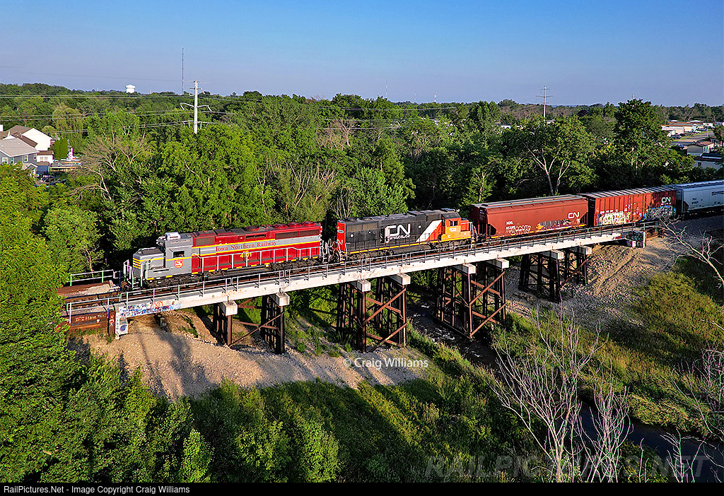 The Cedar River needed the CN 5409 for horsepower, so it didn't go on 338 for Dubuque. It was needed due to tonnage on an 80-car L575. The Cedar River died on the Osage Sub Friday with no 2nd crew to bring power back to Waterloo. Now in Cedar Rapids, the 5417 was dead-tested on Saturday night, and there was no 5409 for replacement. The only choice Saturday night was to run L565's power to CR and 5417 to Dubuque. On Sunday, there is no L567, so on Monday, an extra 567 rolls out of Cedar Rapids with the normal Dubuque local power heading to Manchester. Being that this is rare, I got the IANR 4101 on the CR Sub. Here L567 is now out of Louisa after their work and crosses the Dry Creek near Robins. This power went back to Dubuque Monday night, and both units went bad. It's amazing how some things work out to make power go to a certain train.