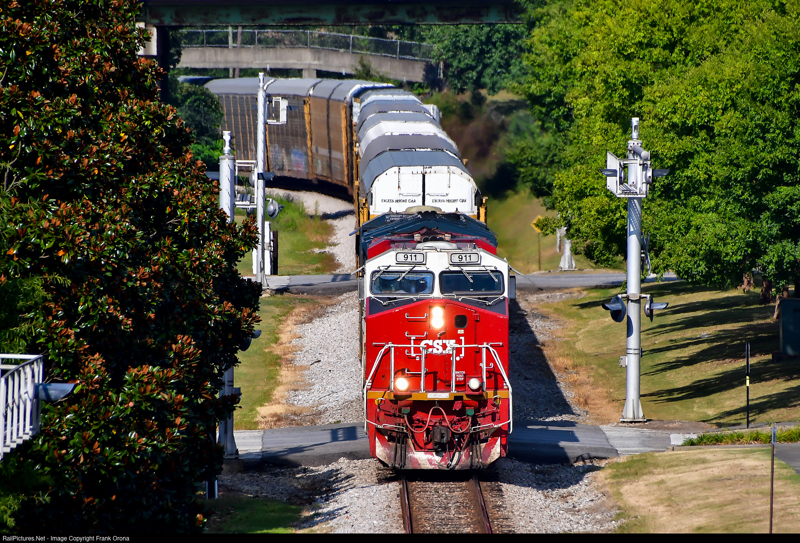 | Reverse The daily Kia-Hyundai train M210 looks great coming into Opelika with 104 cars this afternoon and being lead by the Spirit of First Responders painted locomotive. For over 3 years (April 2023-July 2025) CSX changed the running of this train from its original route (Waycross-Manchester-Montgomery) which made it a southbound train through here, to being placed on Bow Line (Waycross-Dothan-Montgomery) and thus making it a northbound run through Opelika. While that change afforded some new angles of it coming north in the morning, it’s nice to see this train back in the afternoon light rolling south through this city. |
