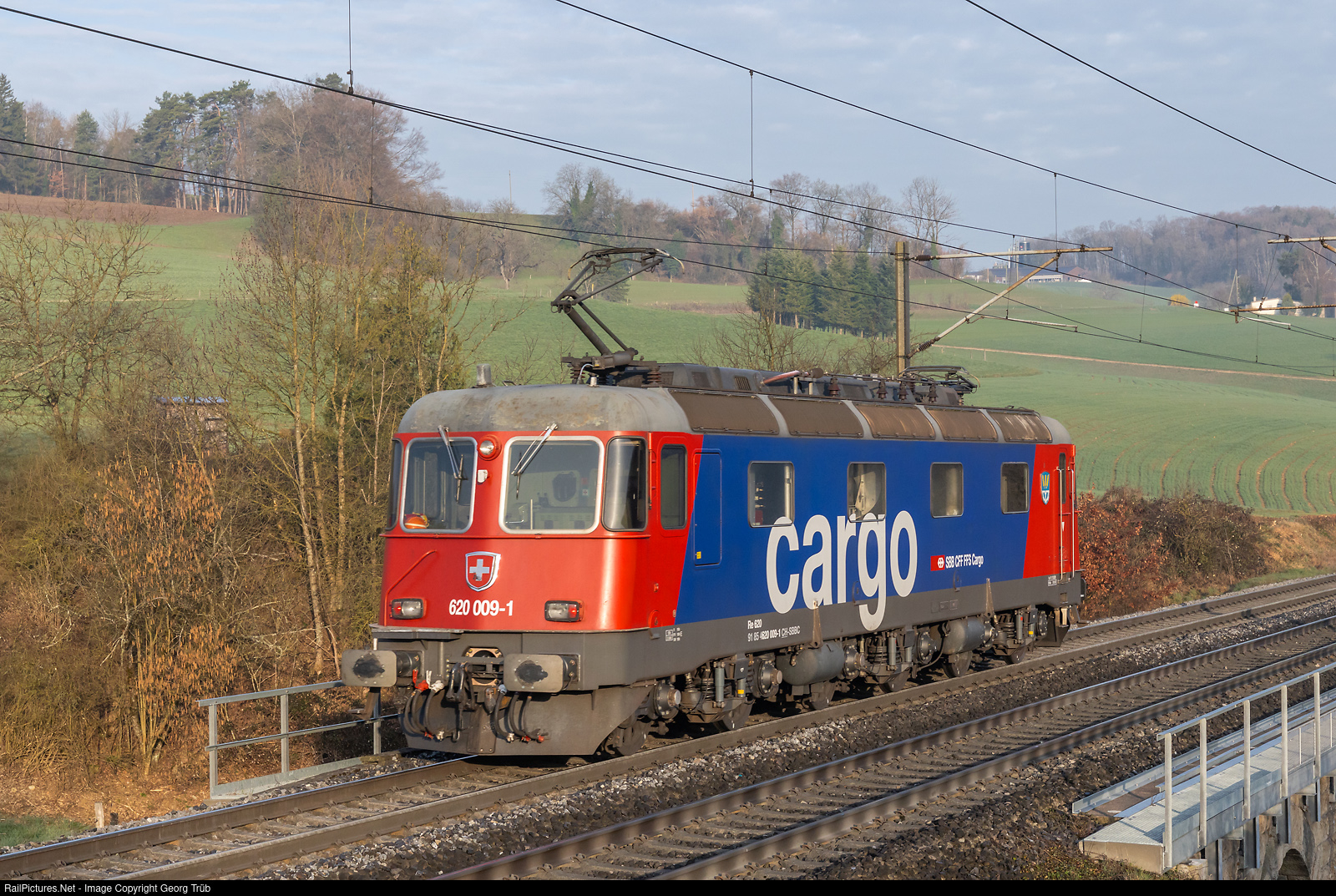 | Re 620 # 009 (Re 6/6 # 11609) of the SBB is running light as train 38522 from Rotkreuz to Basel shunting yard on the Bözberg line between Effingen and Hornussen. |
