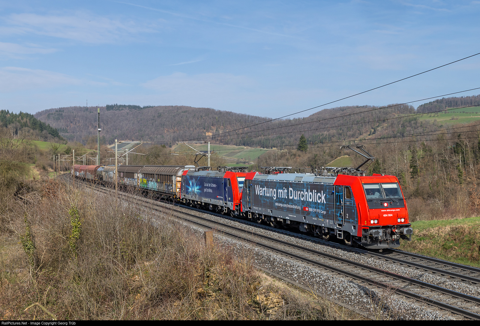 | Bombardier TRAXX F140 MS Re 484 # 004 and # 020 of the SBB Cargo in multiple control pull the freight train 60125 from the Basel shunting yard to the RBL (Limmatttal shunting yard) on the Bözberg north ramp between Hornussen and Effingen. |