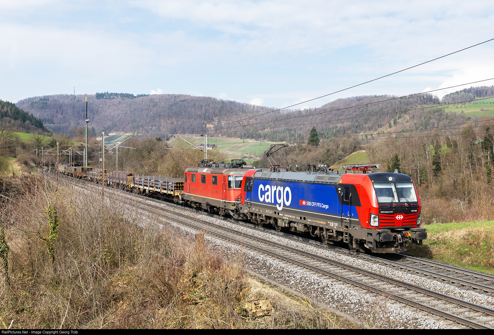 | Siemens "Vectron" 193 # 055 of SBB Cargo, rented from LokRoll3, pulls the southbound freight train 60185 from Basel shunting yard via Gotthard and Ceneri Base Tunnels to Chiasso shunting yard, on the Bözberg north ramp between Hornussen and Effingen. In tow is Re 420 # 264 (Re 4/4 II # 11264). |