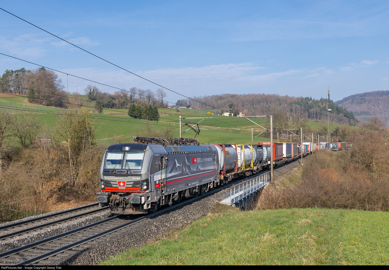 | Siemens "Vectron XLoad" 193 # 454 of SBB Cargo International, rented from SüdLeasing, pulls the southbound intermodal train 40241 from Antwerpen Oderen/Belgium via Gotthard Base Tunnel-Luino to Gallarate (Busto Arsizio Terminal)/Italy, on the Bözberg north ramp between Hornussen and Effingen. Gross load was 1896 tons. |