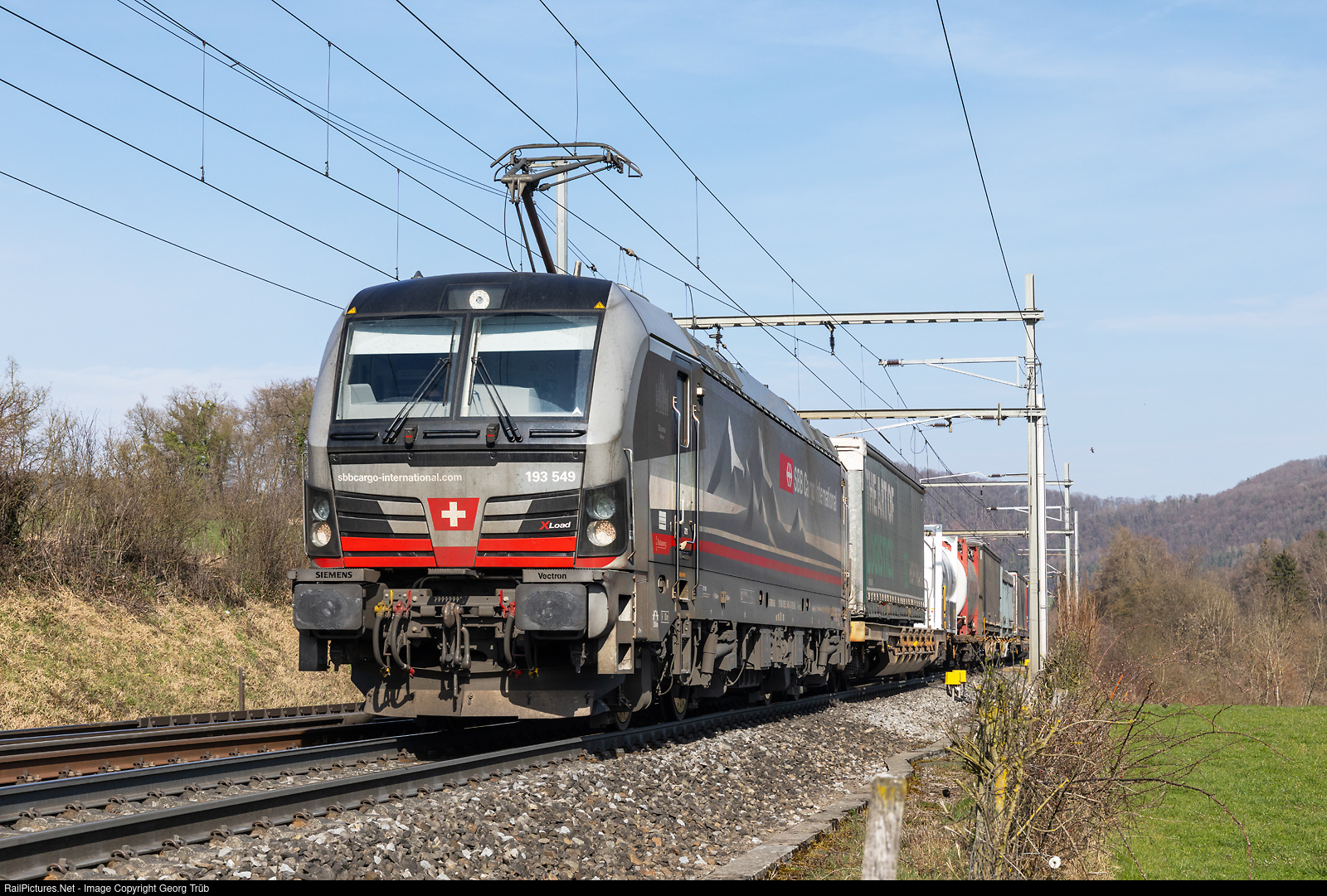 | Siemens "Vectron XLoad" 193 # 549 of SBB Cargo International, rented from SüdLeasing, pulls the southbound intermodal train 40043 from Rotterdam Waalhavn/Netherlands via Basel-Bözberg-Gotthard Base Tunnel-Bellinzona-Luino to Gallarate (Busto Arsizio Terminal)/Italy, on the Bözberg north ramp between Hornussen and Effingen. |