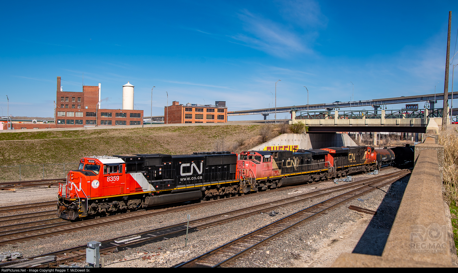| Something Old, Something New (somewhat) A BNSF manifest heads westbound through the West Bottoms with a recently rebuilt CN SD75ICC leading a CN C44-9WL and another CN GE. |