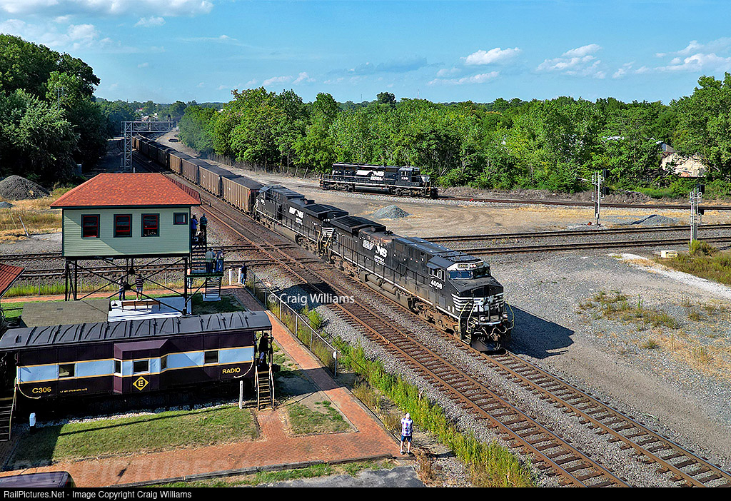 A loaded coal train, 746, rolls past the depot as they make their way east (south) on the Sandusky District. The 110-car train is bound for the Duke Energy Plant in Belews Creek, NC. The train has just crossed the CSXT Mount Victory Sub. Summerail weekend was starting to get going, so the AC tower was a busy place Friday through Sunday as many gathered to see the action between the NS and CSXT here.