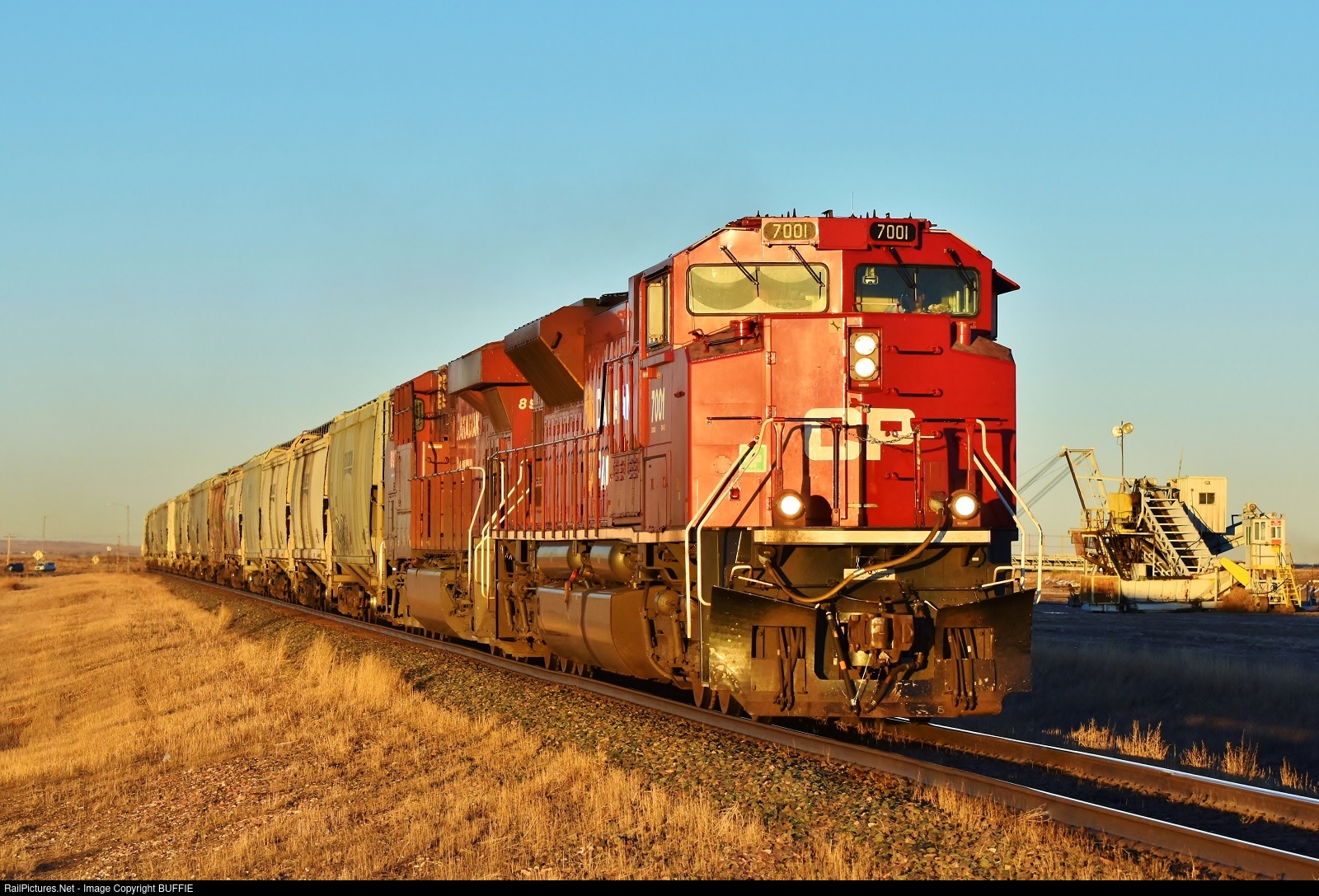 | With only minutes of evening sun left, Canadian Pacific 7001 (SD70ACU) leads a grain train through Wiggins, Colorado on its way to Denver on the Brush Sub.