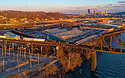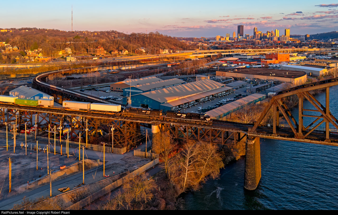 | NS 22H has just entered the Mon Line and is passing CP Isle where the Island Connector diverges from Main 1. The setting sun highlights both the train and the Pittsburgh skyline in the distance. The sun would fall below the hills to the west in a matter of minutes. |