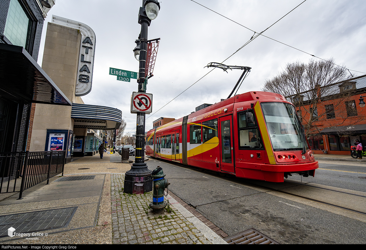 On January 2, 2026, DC Streetcar (United Streetcar Model 100) #201 passes the Atlas Performing Arts Center in Washington, DC, as it makes its way down the H Street–Benning Road Line toward Oklahoma Avenue. With service reductions beginning on January 4 as part of the system’s planned shutdown, January 2 marked the final weekday of full regular service on the line. The DC Streetcar, which began operating in 2016 along the 2.2-mile corridor between Union Station and Oklahoma Avenue, is scheduled to cease operations entirely on March 31, 2026, bringing an end to nearly a decade of streetcar service along the H Street corridor.