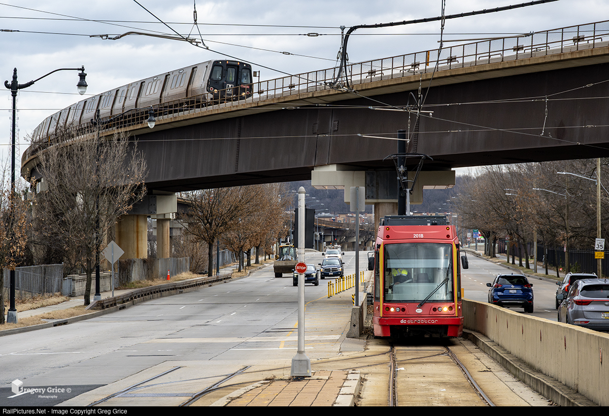 On January 2, 2026, DC Streetcar (United Streetcar Model 100) #201 prepares to head toward Union Station at the extreme eastern end of the H Street–Benning Road Line at Kingman Lake in Washington, DC, as a WMATA Orange Line train passes overhead. Although the line’s eastern passenger terminal is located at Oklahoma Avenue, streetcars continue a short distance beyond the station to Kingman Lake to access a turning track before beginning the return trip west. The line was originally intended to continue further east along Benning Road and connect with the WMATA Blue Line, which also crosses overhead at this same location, but those plans were never realized. Evidence of the proposed expansion can still be seen in the form of track spurs that abruptly end in the median of Benning Road, visible in this photo.
