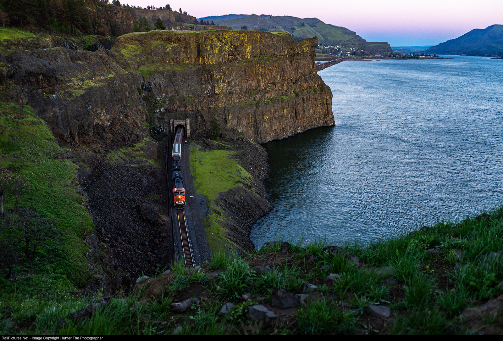 Twilight Tunnels | A few minutes past sunset on a clear Saturday, March 21, 2026 evening, a westbound grain train emerges from Tunnel 10 a couple of miles west of Lyle, WA. Three more short tunnels lie just ahead as the train cruises below the cliffs next to the Columbia River.