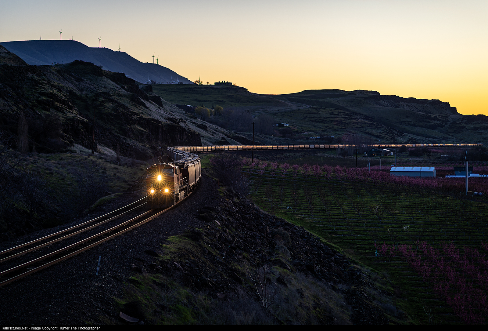 Maryhill Morning | A westbound grain train cruises along a hillside at Maryhill, WA on a cool and clear Sunday, March 22, 2026 morning. Maryhill's Gunkel Orchards sits to the right while, on the hill in the background, a full-size replica Stonehenge can be seen.