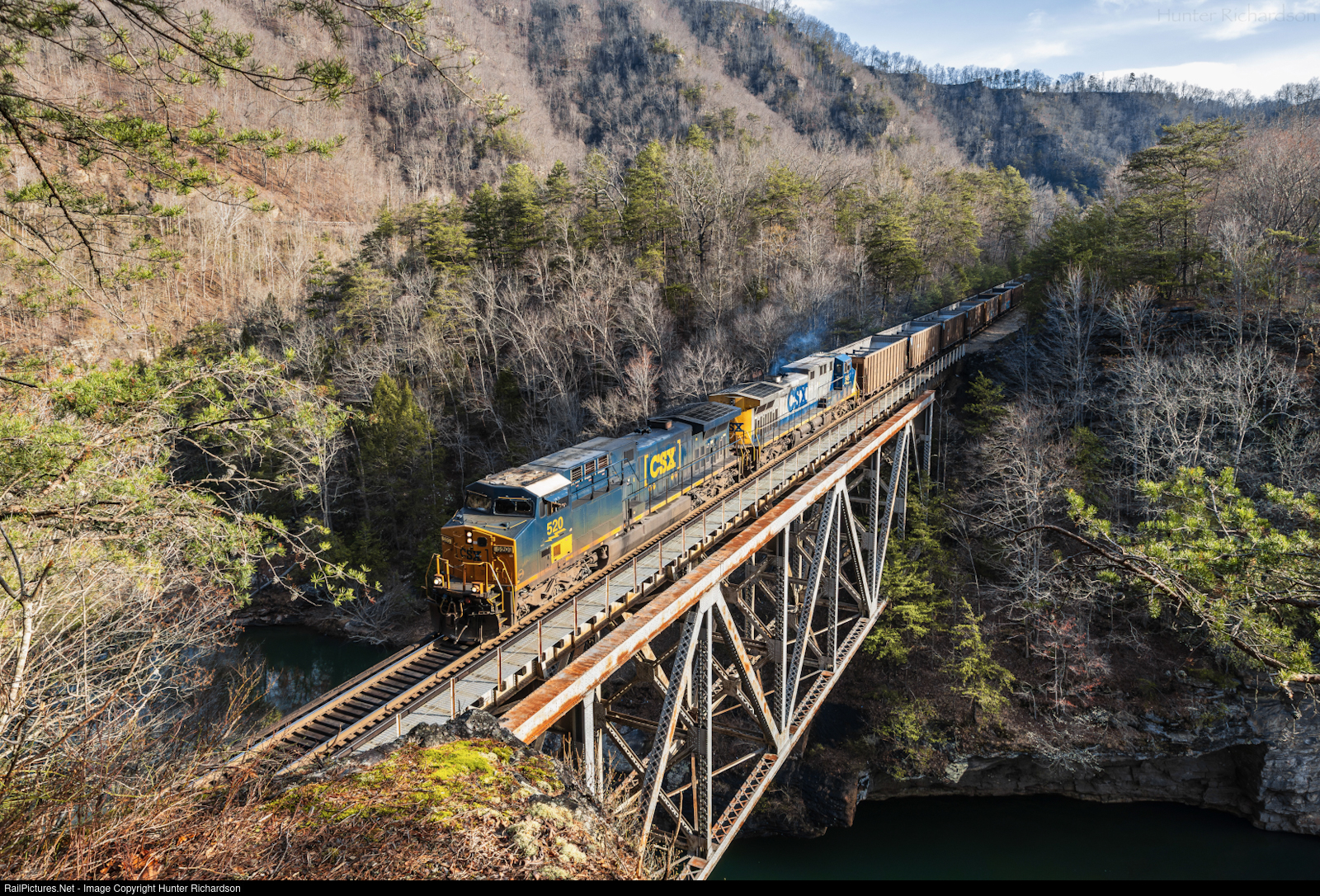 | The whine of dynamic brakes echos through the Breaks Interstate Park as empty DKPX train E758-17 (Terrell - Bailey Mine) crosses Clinchfield’s iconic Pool Point Trestle behind a pair of CW44’s. |