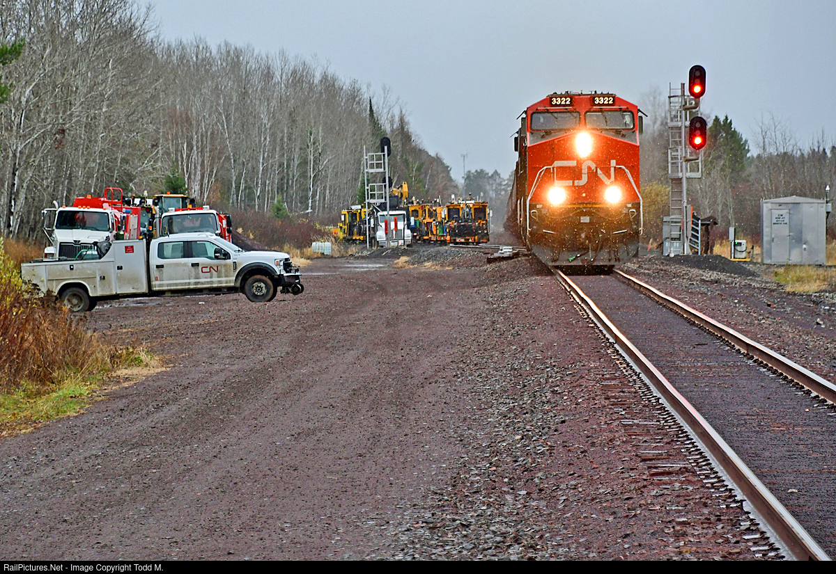 | A light snow falls as CN 3322 makes their way past some track gang equipment at Noimi Jct. on the Minntac Sub on the way up to load pellets at the plant. |