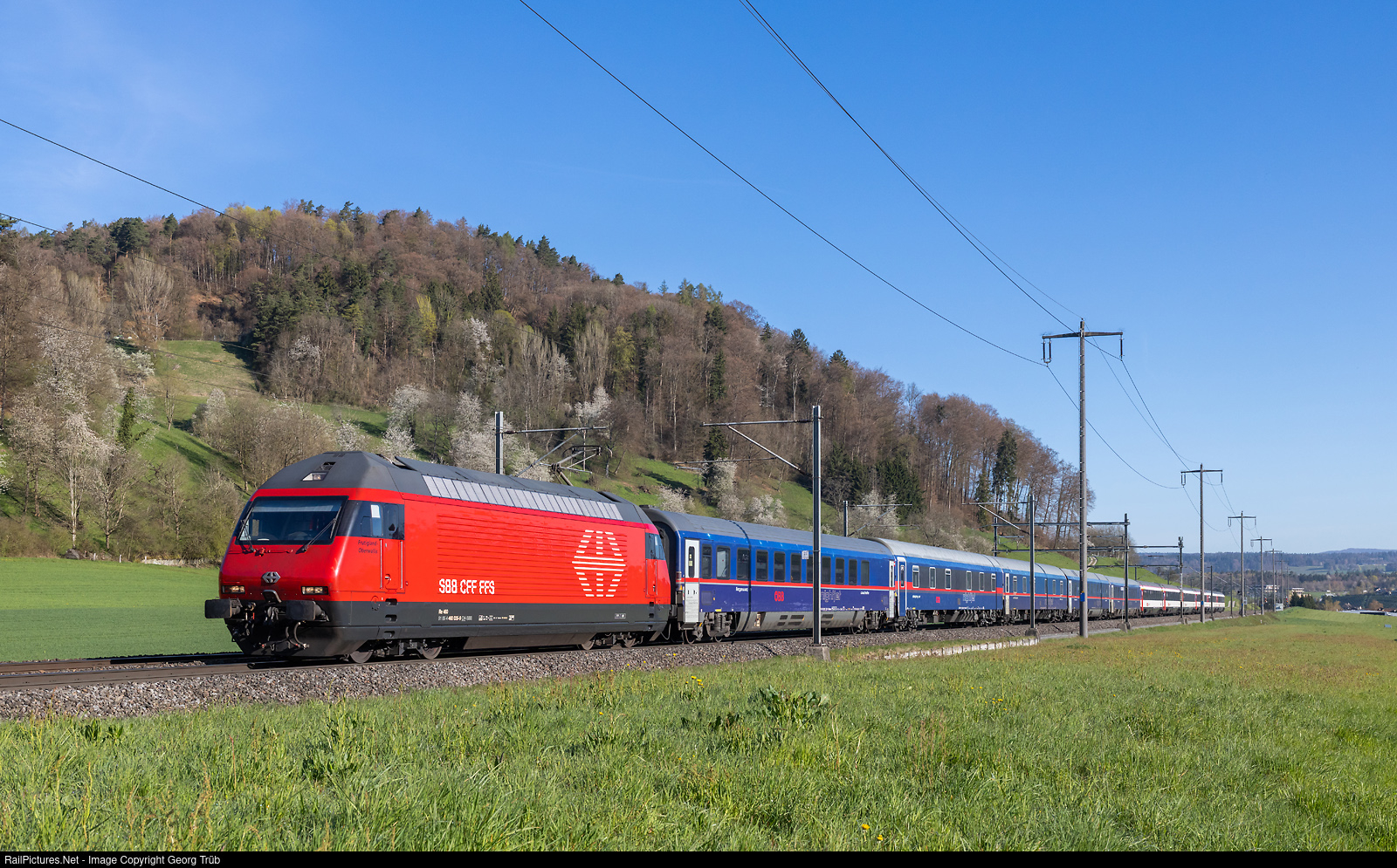 | Re 460 # 035 of the SBB pulls the NightJet 403 from Amsterdam to Zürich, between Eglisau and Glattfelden. Due to a several days closure of the Rhine valley mainline in Germany, the train was rerouted via Stuttgart-Singen (Hohentwiel)-Schaffhausen. |