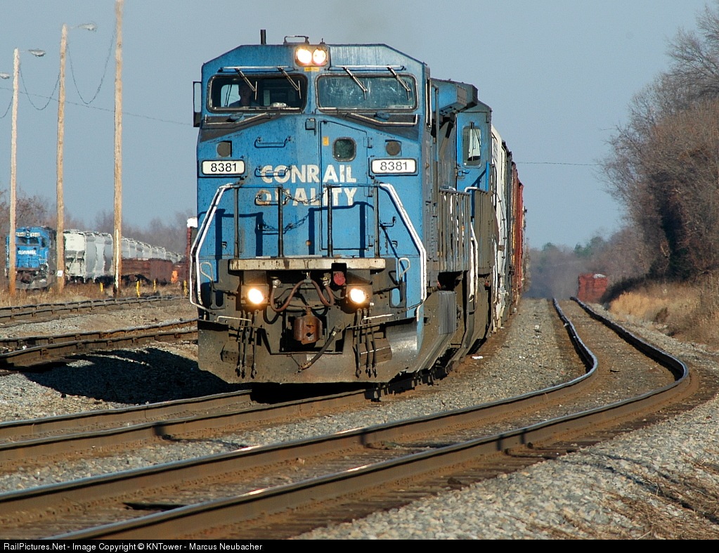 | It's a Big Blue takeover at the south end of NS's old Spencer Yard. NS P61, behind ex-Conrail C40-8W 8381 and C40-8 8313, passes an ex-Conrail EMD tied down in the yard. |