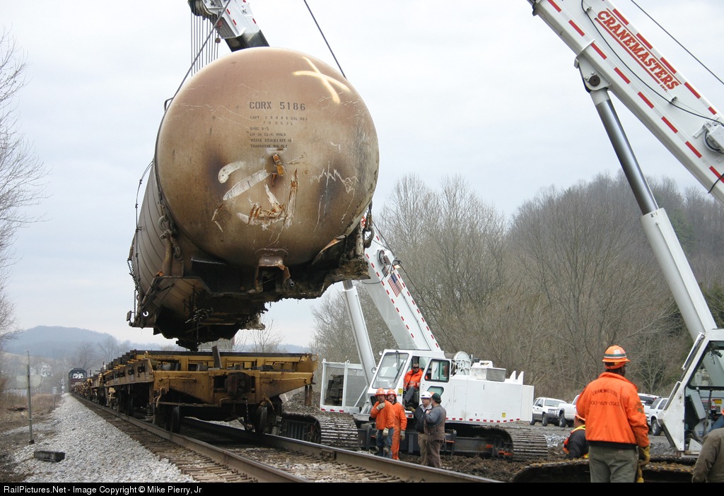 | Two heavy crawler cranes have picked and walked damaged tank (from derailment of last Nov.) so that flat car can be postioned beneath. View is eastbound |
