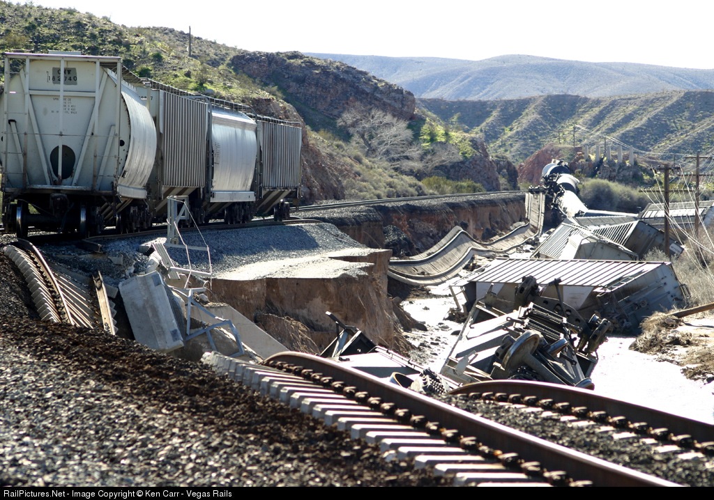 This is a view of the derailment site facing west, you can see the end of the train and the majority of damage from this view.