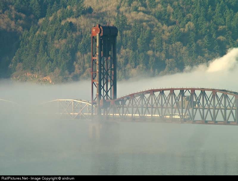Heading north out of Portland an early morning Cascades train breaks through fog crossing the massive BNSF bridge over the Willamette River