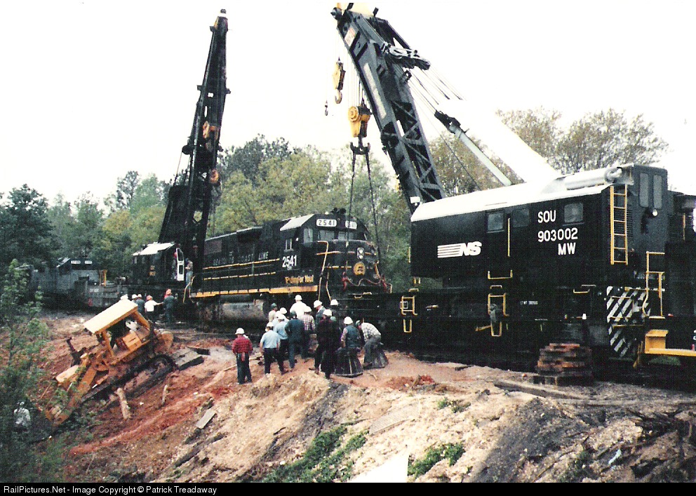 NS and CSX crews working to rerail CSX 2541 after it and four other locos and several cars derailed when WSSB train 209 hit a stalled log truck. This is possibly the last assignment for the CSX big hook.