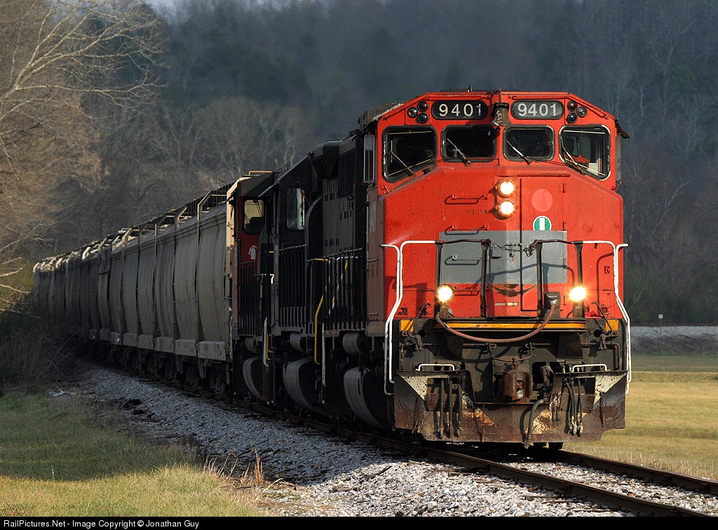 | New power on the Alabama and Tennessee HLCX 9401, LTEX 7371, HLCX 9651 powers a unit grain train move to the Tyson Feed mill in Ivalee. |