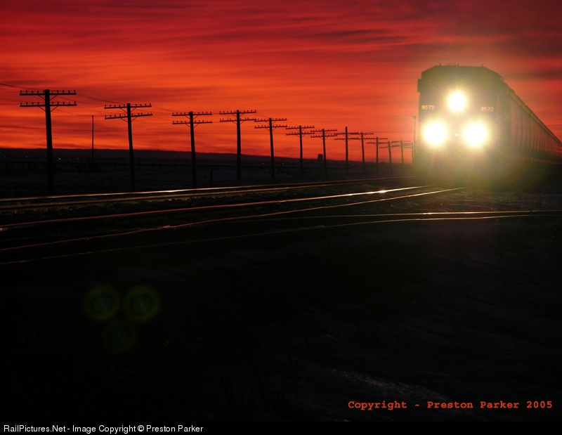 CP 9572 leads a eastbound potash train through Pasqua, Saskatchewan during a brilliant sunset. And no, the photo was NOT altered!