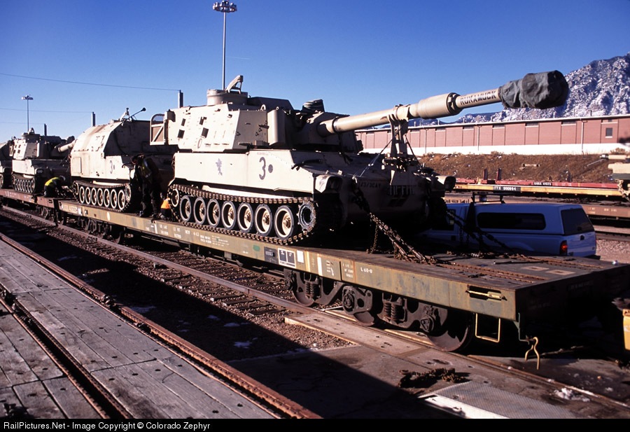BNSF is moved 12 unit trains to Beaumont, TX, from Fort Carson, south of Colorado Springs, CO. 9th train was loaded 2-3-05. M109A6 Paladin with ammo carrier M992. 3rd Armored Cavalry Regiment deployed to Iraq for a year.
