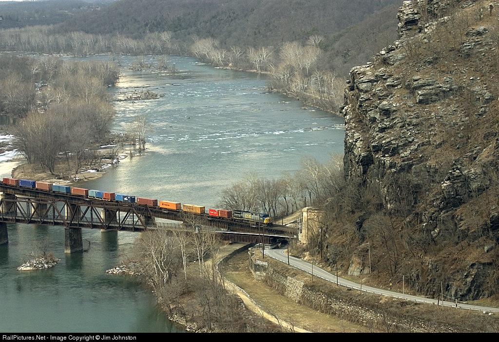 Q130 crosses the Potomac River and is about to enter the west portal of the Harpers Ferry tunnel.