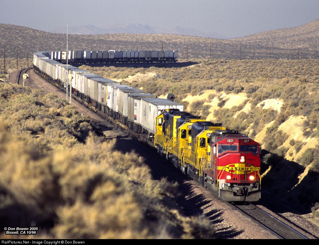 ATSF 127 is on the point of a TOFC train at East Bissell in California's vast Mojave Desert