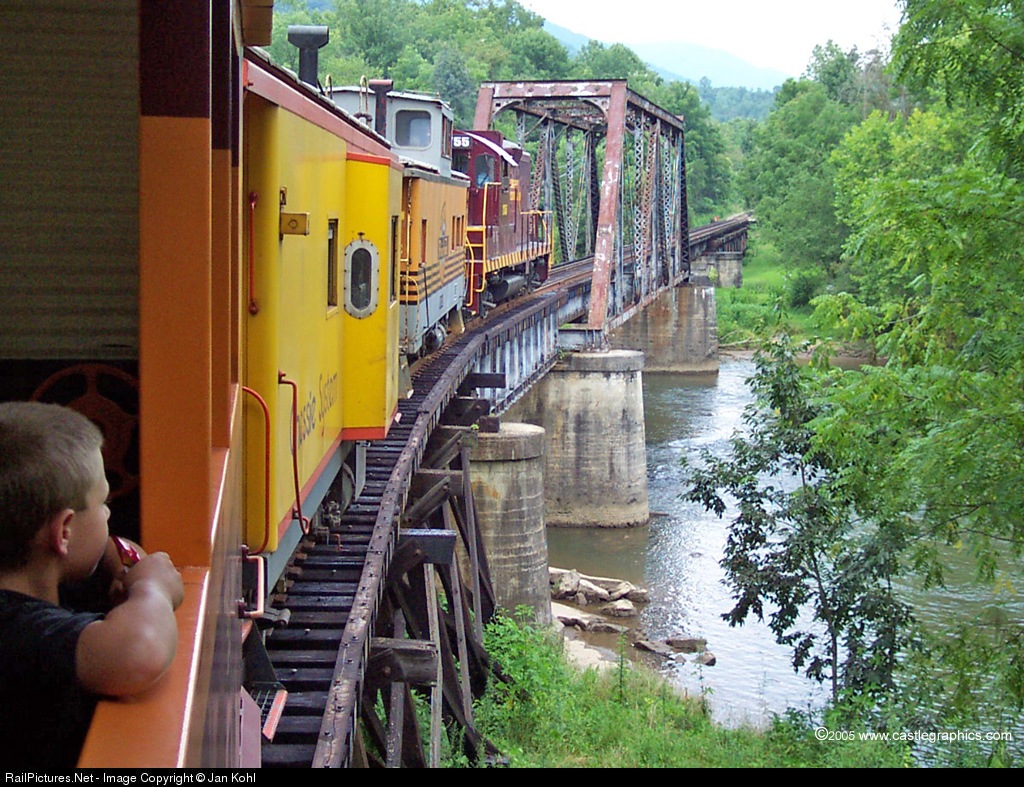 Young railfan looks out in awe as the GSMR GP9 rolls out over the bridge.