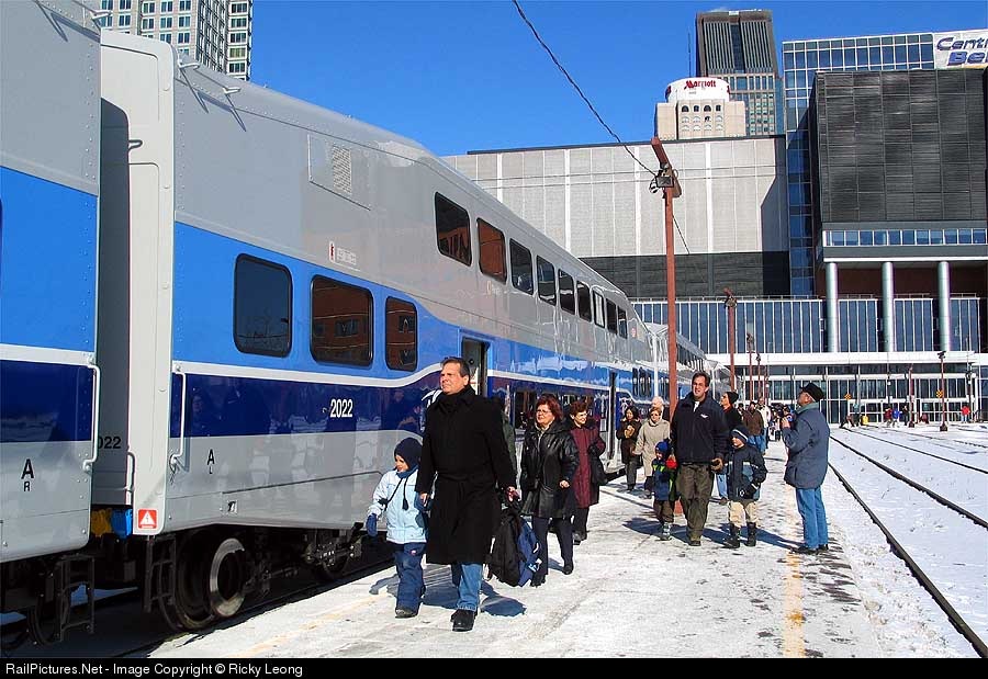 Inaugural run for newly delivered Bombardier BiLevel cars. (Notice how the brake discs are on the outside of the wheels.)
