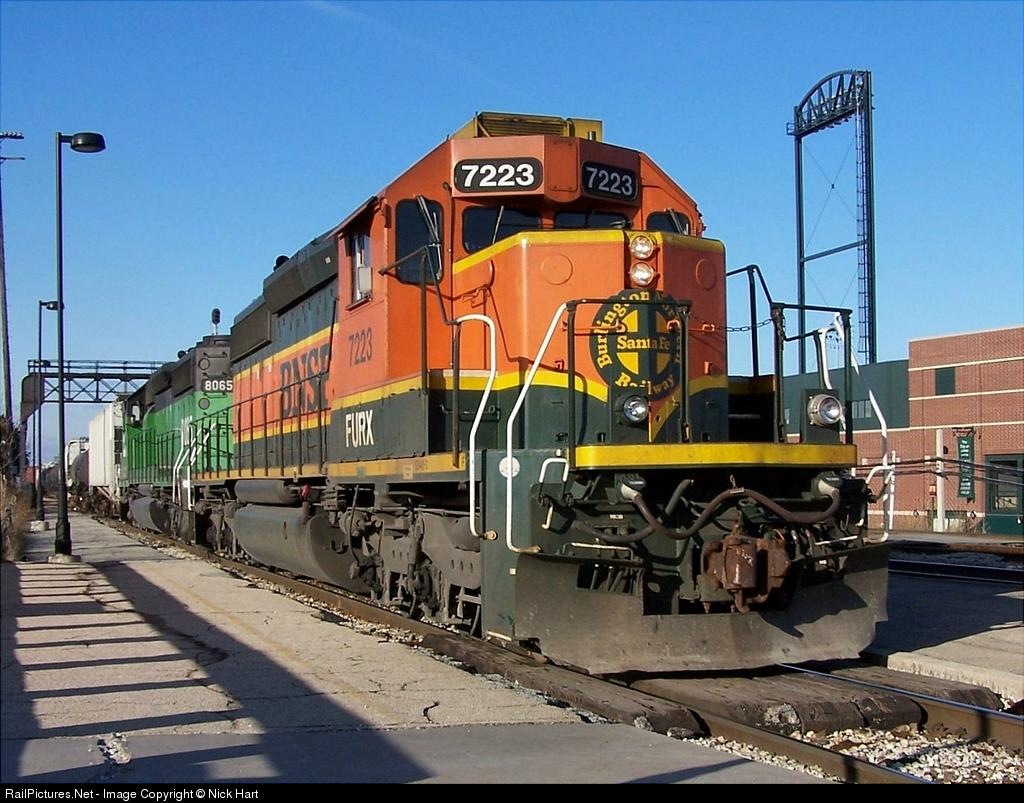 BNSF SD40-2 #7223, and an UNPATCHED green BN SD40-2 #8065 lead a Westbound Manifest through Joliet Station.