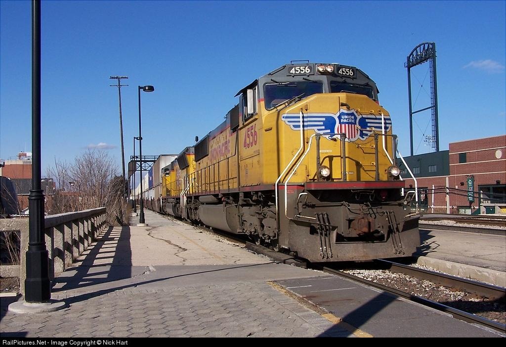 | Two UP SD70M's, #'s 4556 and 4531, lead a Westbound Stacker through Joliet Station. |