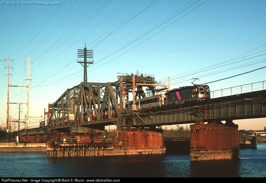 An NJT ALP-44 electric locomotive shoves its train bound for Penn Station in Mid-town over the Hackensack River.