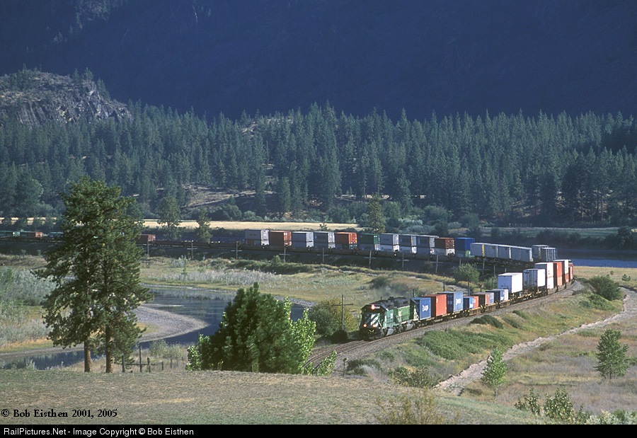 | Afternoon westbound snaking through an S-curve on the MRL. It's the sixth year of BNSF, but still BN lettering. |