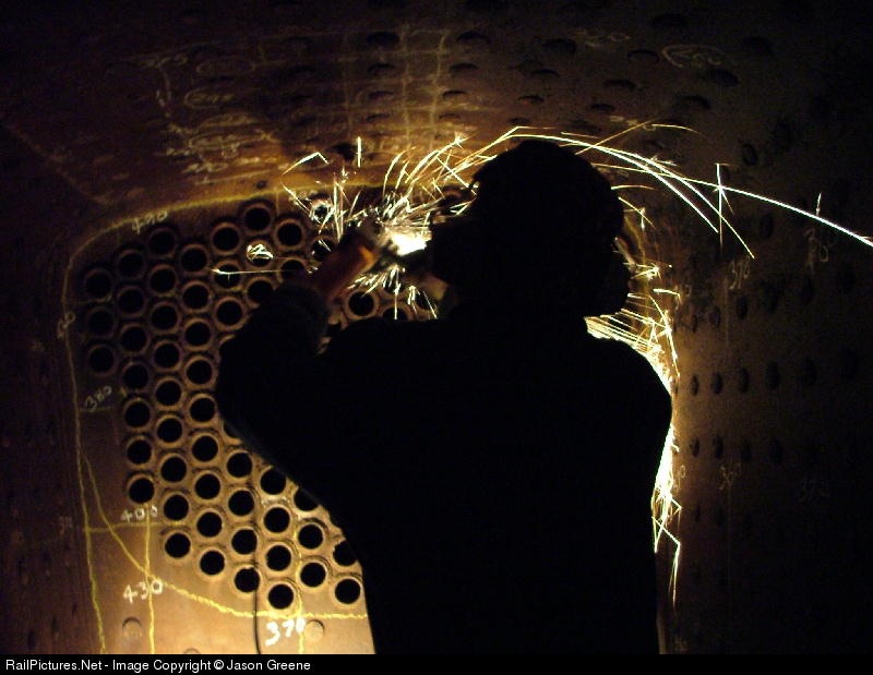 Andrew Durden is grinding on the seal welds on the flu sheet of 97.