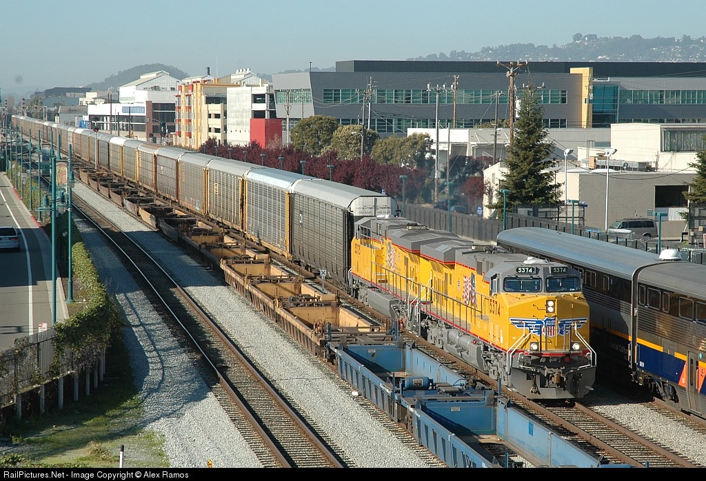 | 2 brand spankin new GEVO's 5374 and 5375, sister units, slide beautifully through Emeryville with a 7000'+ empty auto rack train. Nikon D70 18-70mm. www.bayarearailroading.com |