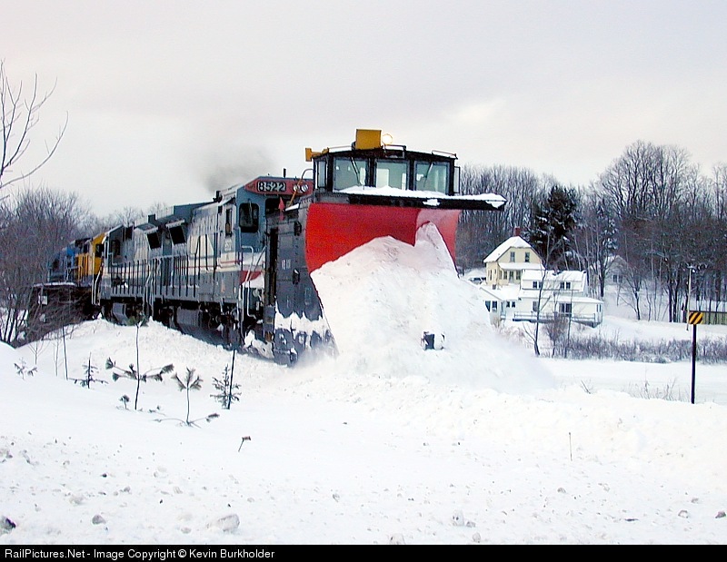 After another 2-3 feet of snow fell and as another 2 feet is expected, MMA dispatched their plow, VB 101, to clear various routes around the system. MMA B39-8Es 8522 and 8536, along with C30-7 3614 and B23-7 2000 shove the VB101 through Milo on Thursday.