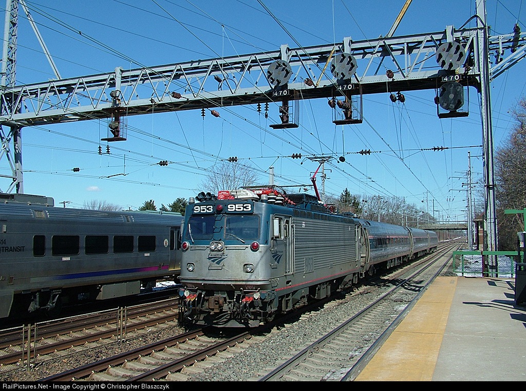 | While a NJT train makes its station stop, AMTK 953 flies past southward, on a normally northbound track, with a three-car Keystone train. |