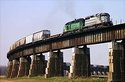 Smoking second generation diesels hauling mixed freight over rusty bridges. A slowly dissapearing scene of classic North American Railroading.