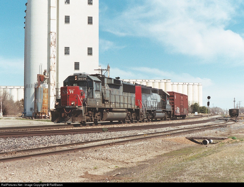 | A UP local with two unpatched SP motors races past the landmark grain elevators at Hutch with a single car as they head to the yard to tie up. |