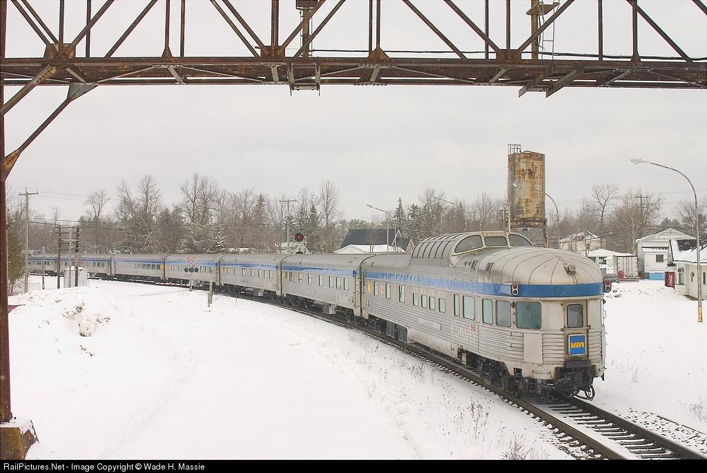| The Canadian is probably the best looking passenger train in North America. After a brief stop at Washago, #1 continues on its cross country trek through the snowy landscape of Ontario. |