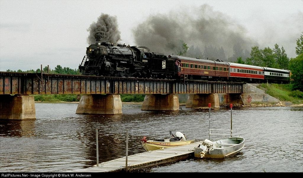 | Soo Line Mikado 1003 leads a passenger special westbound across the Whitefish River Bridge on the return leg of a Gladstone to Manistique trip that was sponsored by the DSSA Division of the Soo Line Historical and Technical Society on August 7, 1999. |