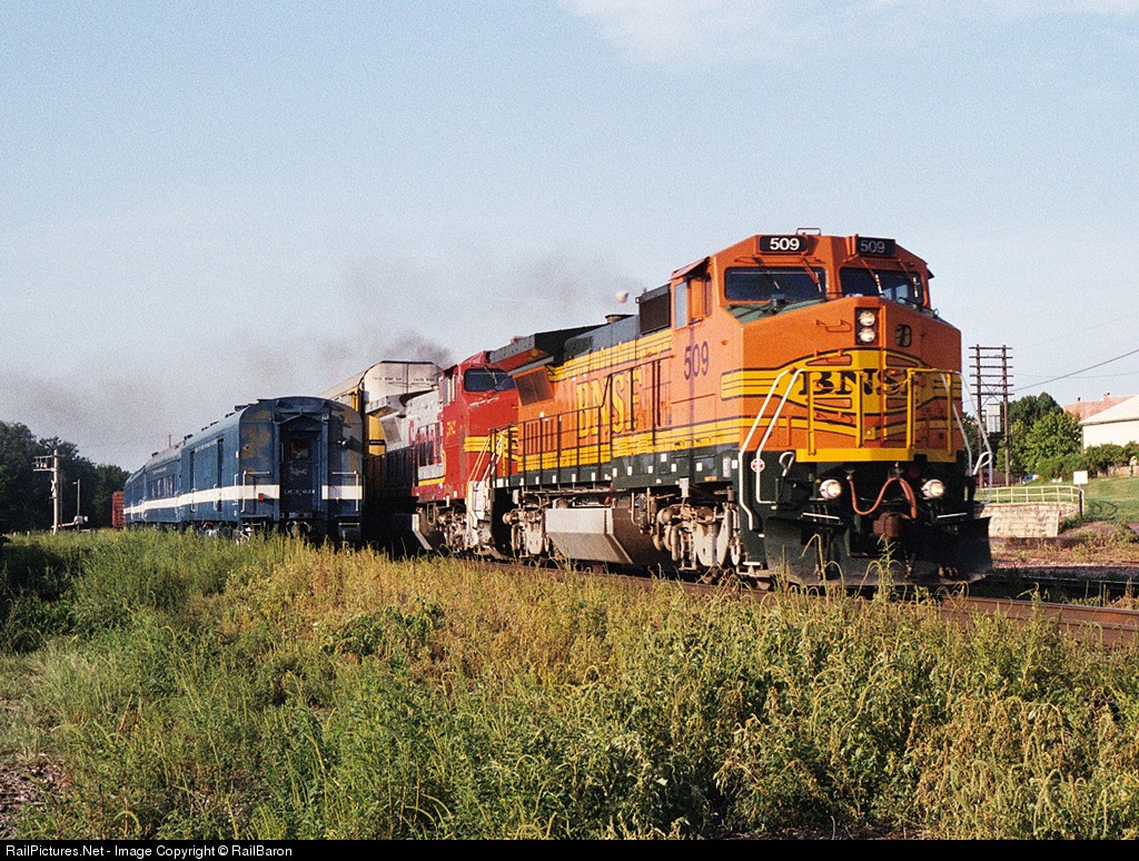 | BNSF 509 and 582 emerge from behind a cut of Dodge City, Ford and Bucklin Railroad passenger cars at Guthrie with the Argentine to Pearland vehicle train. |